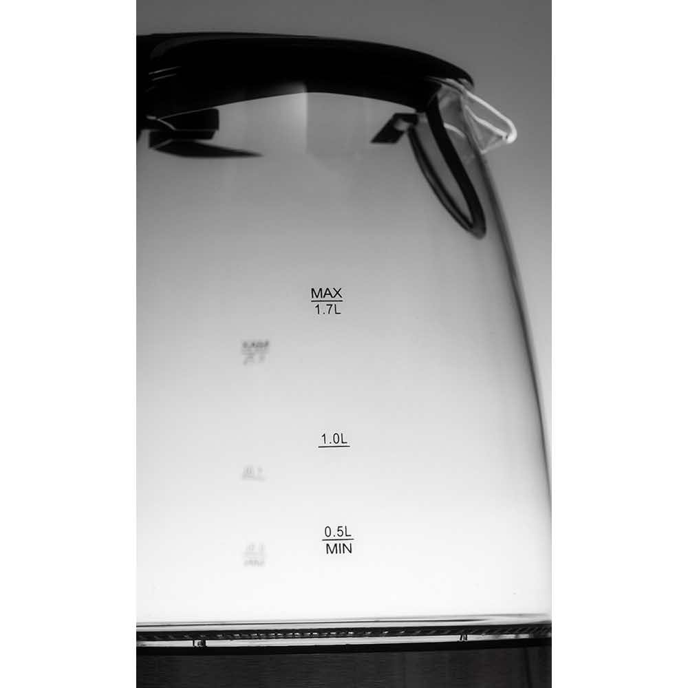duży, elektryczny czajnik, pozwalający sprawnie zagotować wodę na herbatę dla 6-7 osób pojemność: 1,7L pojemność min: 0,5l moc: 2000 W obrotowa podstawa i płaskie dno nowoczesne wzornictwo wskaźnik poziomu wody z podziałką filtr zatrzymujący osady wapnia grzałka ze stali szlachetnej automatyczne wyłączanie po zagotowaniu wody lampka kontrolna obudowa wykonana ze szkła rok gwarancji kolor: transparentny/czarny