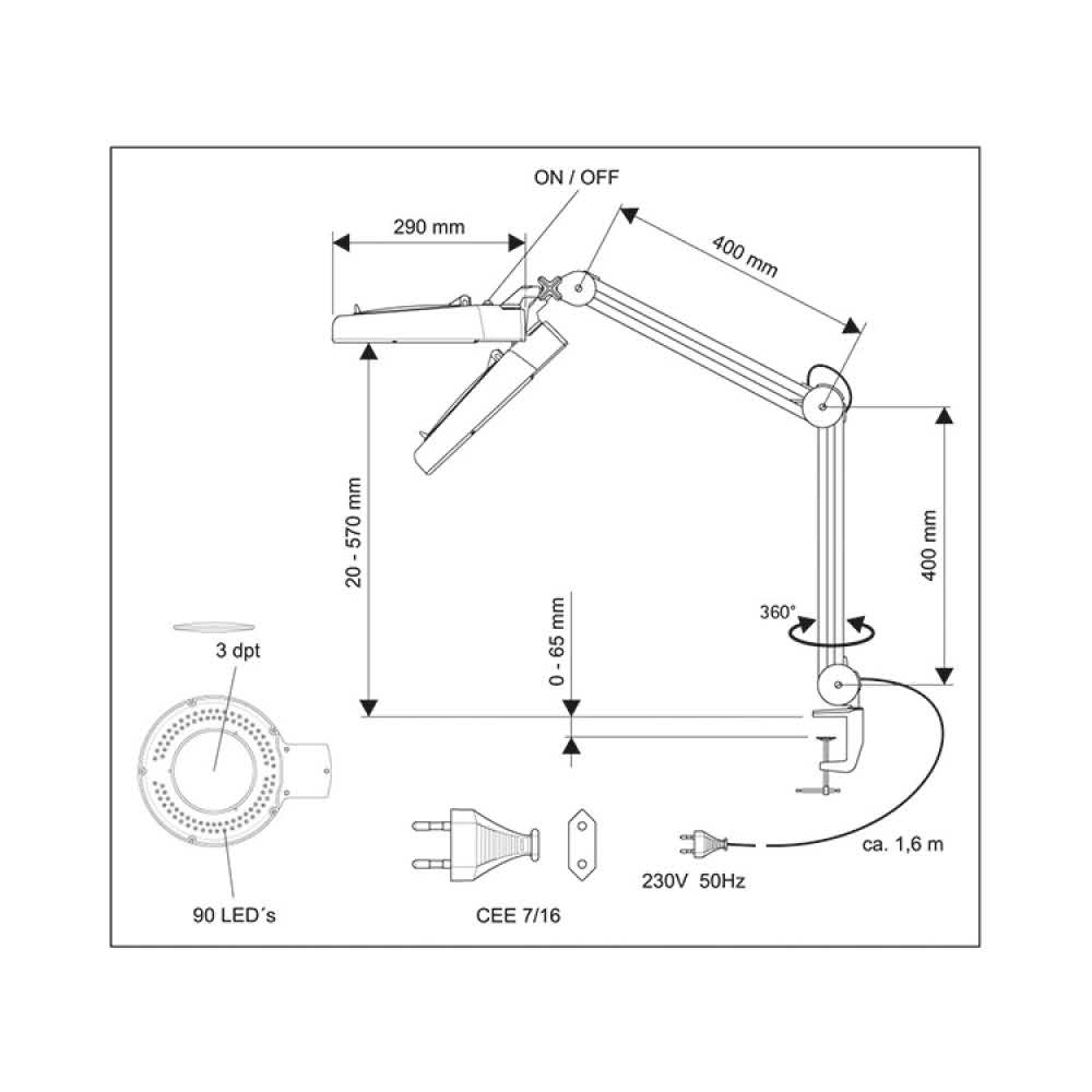 idealna do precyzyjnych prac w laboratoriach, warsztatach, biurach konstrukcyjnych, gabinetach lekarskich także dla kolekcjonerów znaczków pocztowych, w mechanice precyzyjnej, a także jako pomoc przy czytaniu drobnego druku dwufunkcyjna jako szkło powiększające i jako oświetlenie biurka ma klapkę chroniącą soczewkę przed kurzem i światłem słonecznym duże możliwości regulacji lampy w każdym kierunku wyjątkowo niski pobór energii nie pobiera mocy w stanie OFF mocne równoległoboczne ramię wykonane z metalu kołowe rozmieszczenie żarówek LED umożliwia równomierną emisję światła, bez rzucania cienia w obrębie strumienia światła opatentowana koncepcja bezpieczeństwa technicznego opracowana przez inżynierów MAUL szklana soczewka 3 dioptrie (współczynnik powiększenia 1,75) średnica soczewki: 12,7cm powierzchnia soczewki: 126cm źródło światła: 90 diod LED, wbudowane, niewymienne temperatura barwowa: światło białe dzienne (6500K) żywotność diod LED: 10000 godzin świecenia klasa energetyczna: A średnie zużycie energii: 6 kWh/1000h natężenie oświetlenia: 1340lx w odległości 35cm strumień świetlny: 410lm solidne metalowe ramię z możliwością obrotu o 360° ramię dolne i górne o długości 40cm wysokość w normalnej pozycji roboczej: 42cm głowica oświetleniowa o średnicy 22,5cm, z wbudowanym przełącznikiem uchwyt mocujący wykonany z tworzywa i metalu, do blatu o grubości do 6,5cm 2 lata gwarancji kolor: czarna