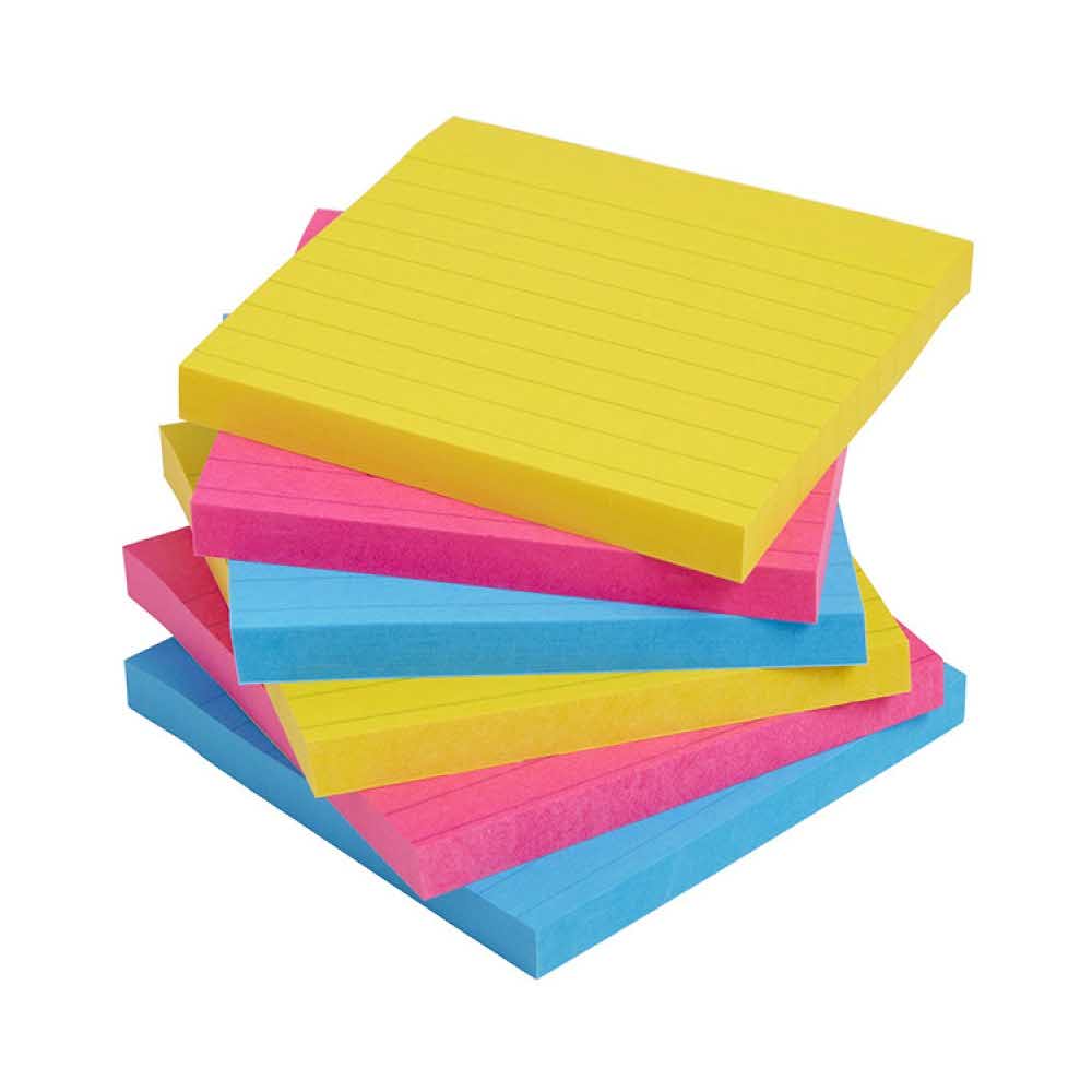 Kolorowe karteczki w linie, które przyklejają się praktycznie do wszystkiego ilość karteczek: 6×90 w rozmiarze 101x101mm gramatura: 74gsm super mocne – pozostają przyklejone na długo super przyczepne – przyklejają się do trudnych powierzchni super przebojowe – wyróżniają się dzięki kolorom 6 sztuk w j.s. kolor: mix kolorów (paleta Rio De Janeiro).