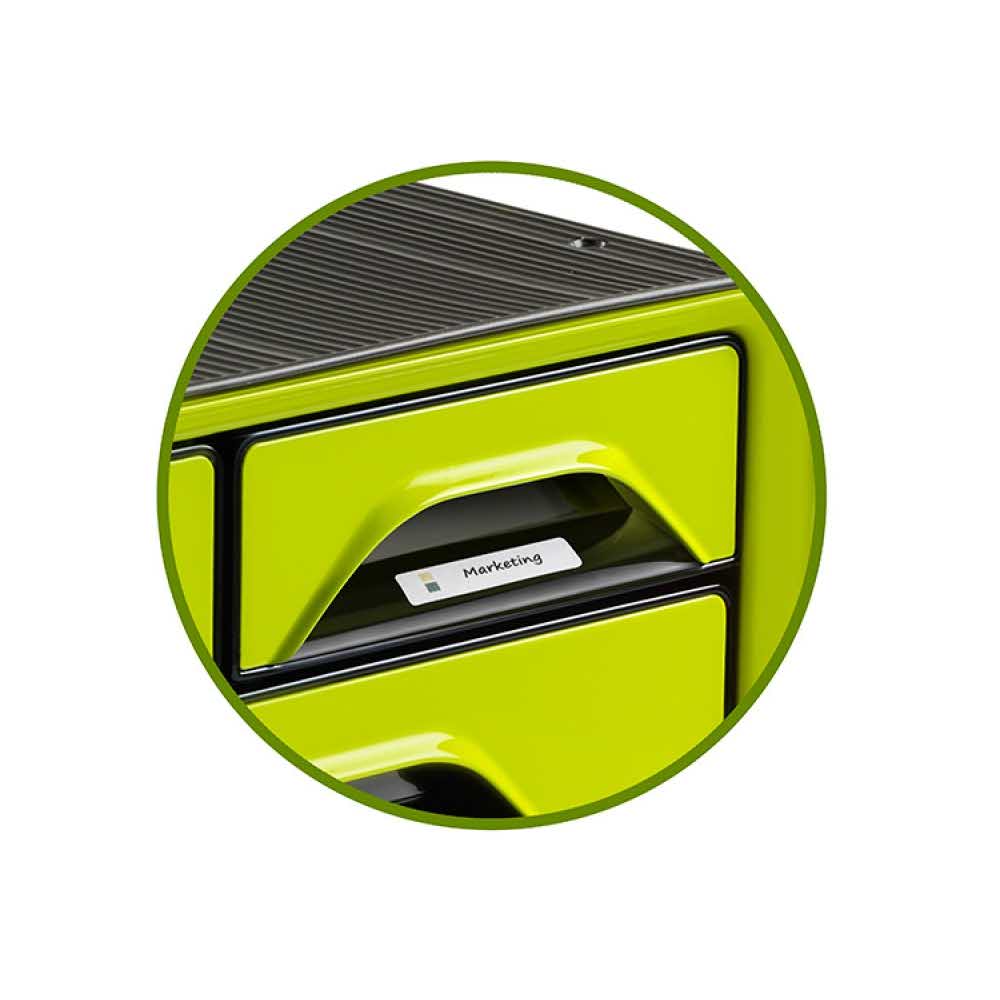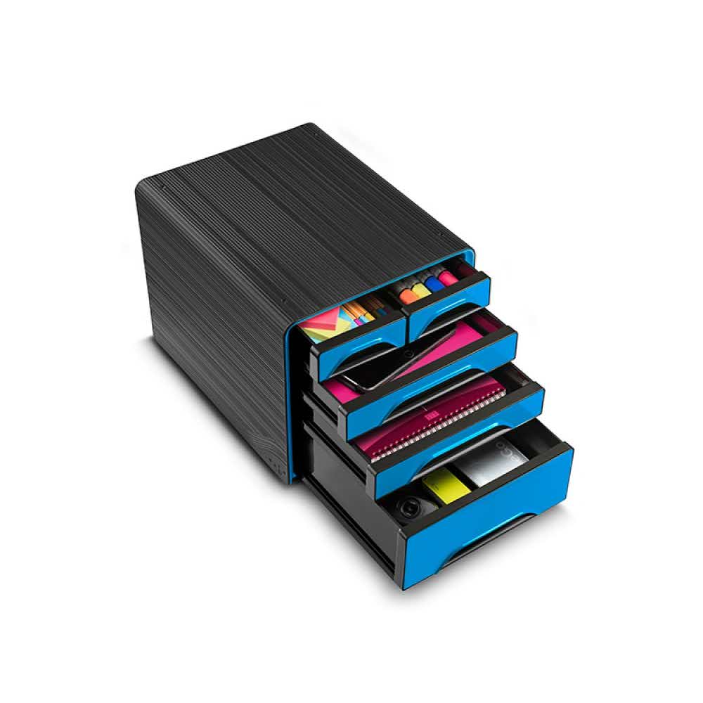 zestaw 5 szufladek wykonanych z wysokiej jakości plastiku w 100% recyklowanego wyposażony w ergonomiczne uchwyty z ogranicznikami na każdej szufladzie zestaw zawiera: 2 małe szufladki o wymiarach 32,2×10,8×3,7cm 2 standardowe szufladki o wymiarach 32,2×24,4x4cm 1 dużą szufladkę o wymiarach 32,2×24,4×8,5cm 6 etykiet opisowych podkładki antypoślizgowe zabezpieczające powierzchnię blatu przed porysowaniem wymiary: 36×28,8x27cm kolor: czarny/niebieski