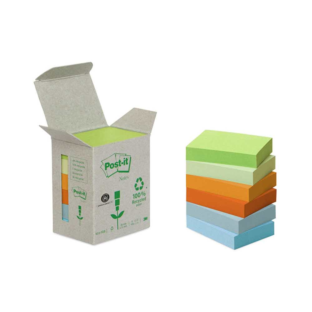 ekologiczne karteczki samoprzylepne z certyfikatem Blue Angel to funkcjonalność klasycznych karteczek Post-it® w połączeniu z najwyższym standardem dbałości o środowisko naturalne karteczki i karton wyprodukowano z surowców wtórnych i nadaje się w 100% do recyklingu kolekcja 6 wyjątkowych kolorów karteczek: Trawiasto Zielone, Limonkowo Zielone, Pomarańczowe, Marchewkowo Pomarańczowe, Błękitne, Jasno Niebieskie rozmiar 38×51 skład: Papier 80g/m, z certyfikatem Blue Angel UZ14B, bielony bez użycia chloru klej repozycjonowalny 3M w technologii mikrosferycznej, w 60% z roślin po użyciu produkt nadaje się do recyklingu opakowanie zawiera 6 bloczków po 100 karteczek w pastelowych kolorach, w rozmiarze 38x51mm kolor: mix kolorów
