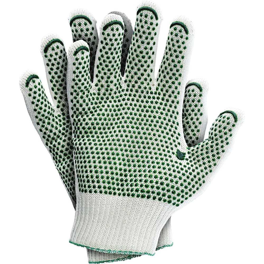 Rękawice ochronne dziane z jednostronnym nakropieniem. – wykonane metodą platerowania – wewnątrz bawełna, z zewnątrz poliamid HT – bezszwowe – dobrze przylegają do dłoni – nakropienie PCV na wewnętrznej części dłoni poprawia pewność chwytu i operowanie przedmiotami – bawełna wewnątrz zapewnia wysoki komfort pracy – zgodne z normami EN420 i EN388 (poziomy odporności 2 1 4 2)