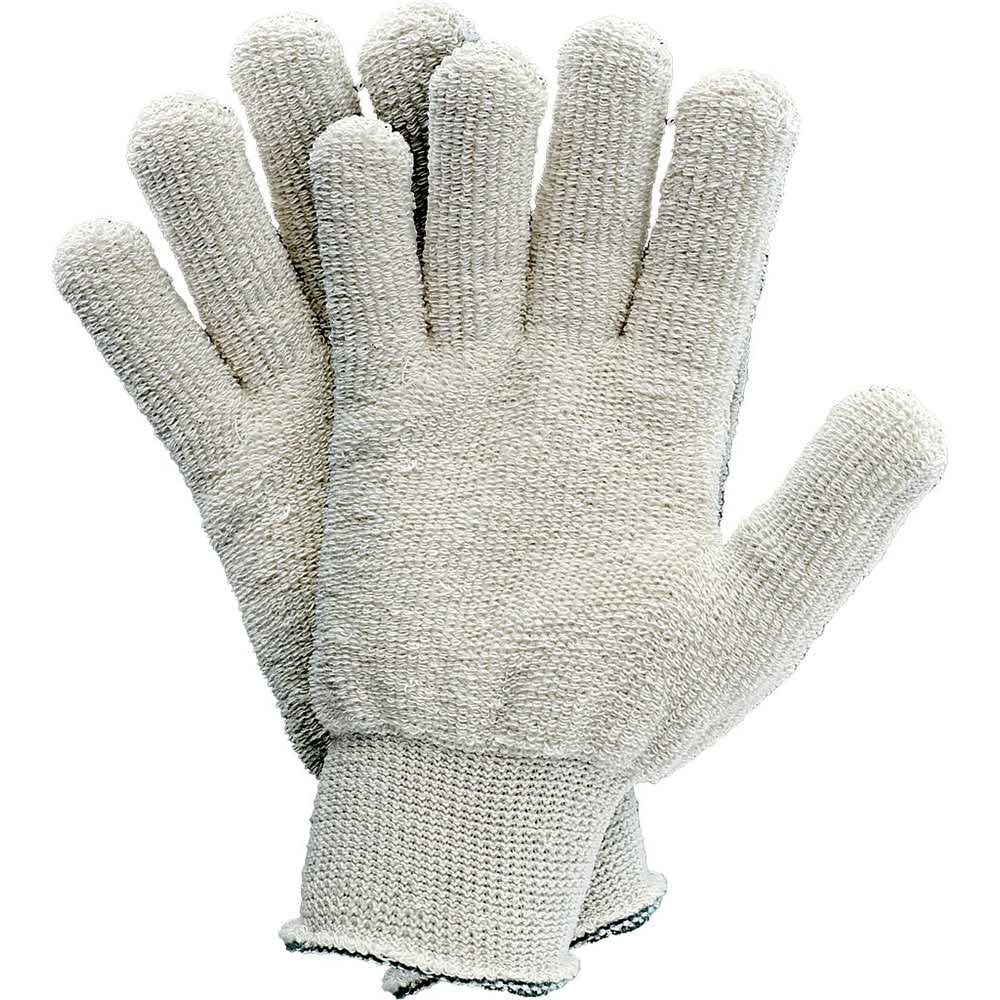 Rękawice ochronne dziane termiczne. – 100% bawełna – wykonane z dzianiny pętelkowej typu frotte – bezszwowe – odporne na temperaturę do 250°C – zgodne z normami EN420, EN388 (poziomy odporności 1 2 4 1) oraz EN407 (poziomy odporności X 2 X X X X)