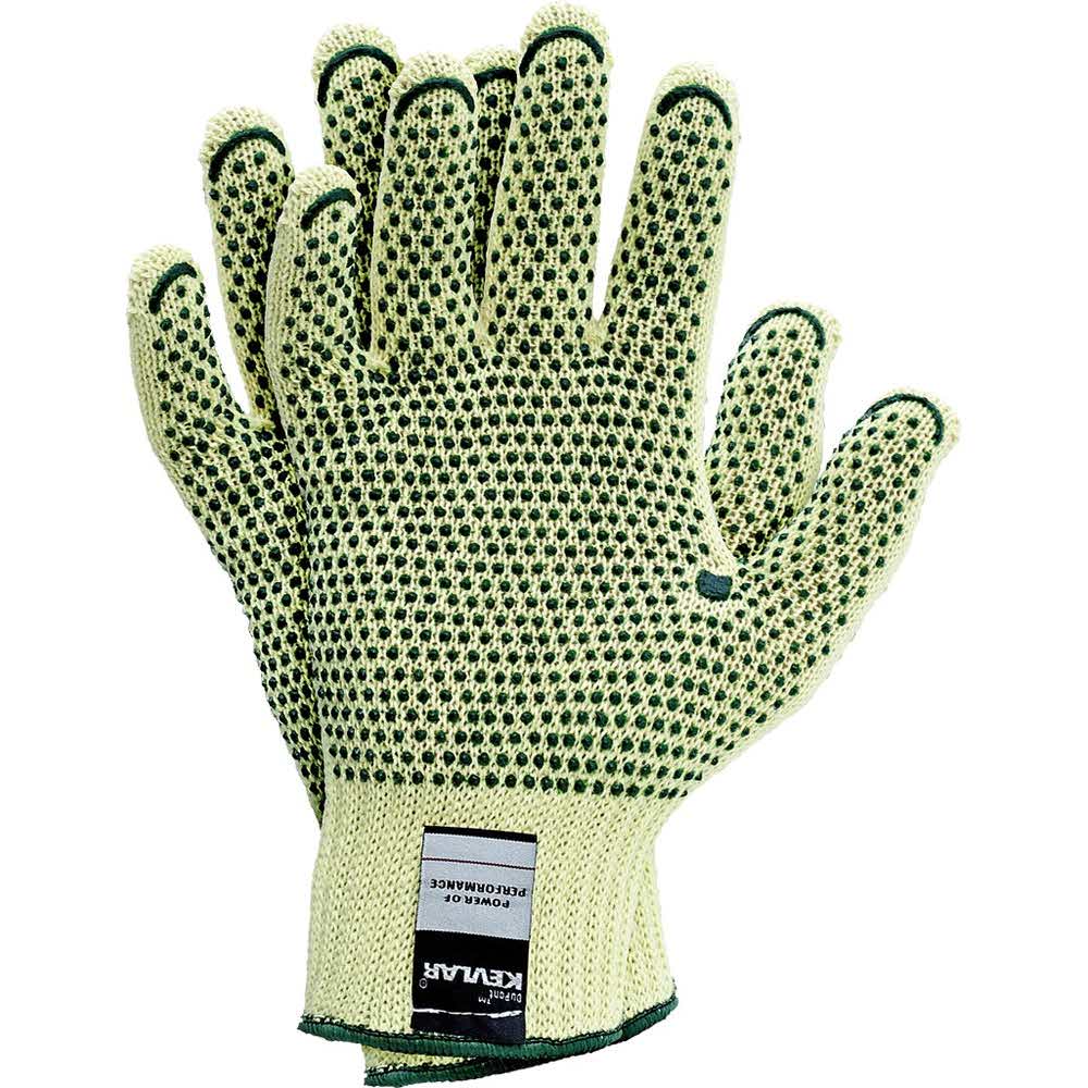 Rękawice ochronne dziane z jednostronnym nakropieniem. – wykonane z przędzy para-aramidowej Kevlar® (ścieg 7) – nakropienie PCV na wewnętrznej części dłoni poprawia pewność chwytu i operowanie przedmiotami – bezszwowe – charakteryzują się dobrą odpornością na przecięcie (3) oraz wysoką na rozdarcie (4) – dobra ochrona cieplna w przypadku niewielkich zagrożeń termicznych – zgodne z normami EN420 i EN388 (poziomy odporności 1 3 4 X)