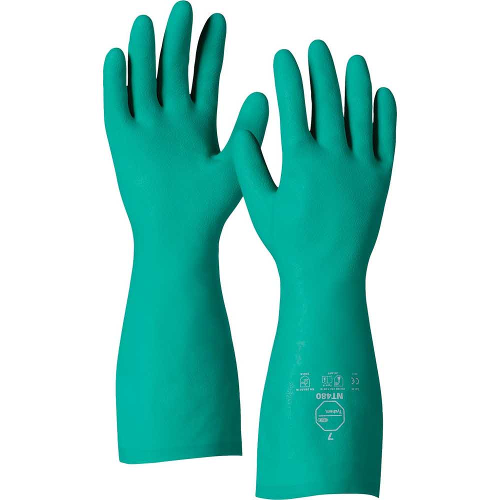 Rękawice Tychem ® NT480 . – flokowane rękawice nitrylowe o wysokiej odporności chemicznej, wygodzie oraz dobrej chwytności – szorstkowane wykończenie części chwytnej sprawia, że praca w wilgotnym środowisku staje się łatwiejsza i bezpieczniejsza – elastyczne, wchłaniają pot – chronią dłonie przed olejami, węglowodorami, smarem i otarciem – grubość: 0,38 mm – długość: 330 mm – nie powodują alergii – dopuszczalne do kontaktu z żywnością – zastosowania: czyszczenie, obróbka chemiczna, napełnianie zbiorników, odtłuszczanie i utrzymanie ruchu – spełniają wymagania norm: EN388, EN374-1, EN374-5