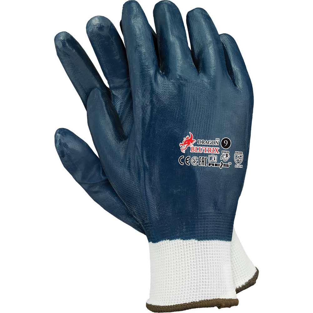 Rękawice ochronne wykonane z poliestru, powlekane nitrylem, zakończone ściągaczem. – część wierzchnia i chwytna oblewana powłoką z nitrylu w kolorze granatowym – odporne na ścieranie, przetarcie czy też przebicie – zapewniają manualność oraz doskonałe czucie trzymanego przedmiotu – nitryl zwiększa odporność na smary, oleje, tłuszcze i węglowodory – zachowują swoją formę i tym samym mogą być prane – sprawdzają się w miejscach, gdzie następuje kontakt z wyżej wymienionymi substancjami – nitryl ulega biodegradacji, dzięki czemu rękawice nitrylowe są bezpieczne dla środowiska – doskonałe dla mechaników, wykorzystywane podczas przeładunku i transportu – zgodne z normami EN388 (przykładowe poziomy odporności: 3 1 3 1 X) i EN420