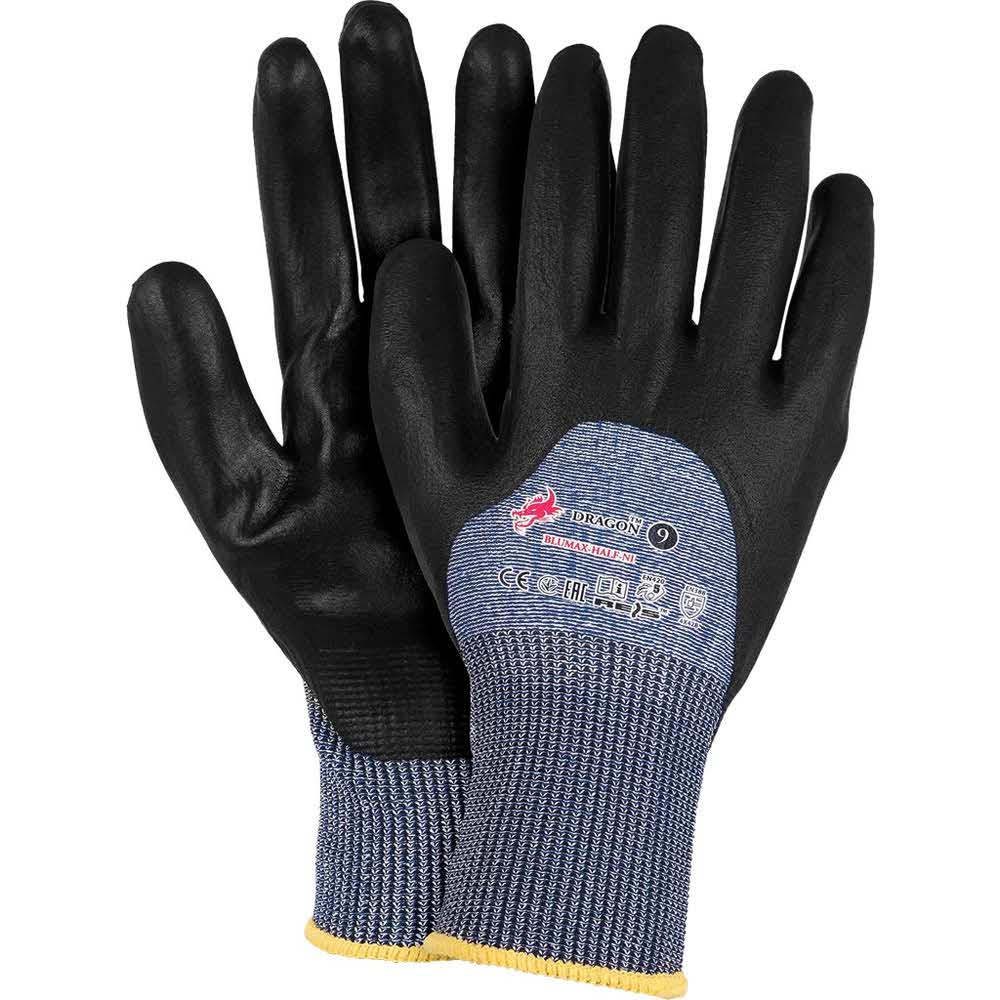Rękawice ochronne powlekane nitrylem. – wykonane z przędzy UHMWPE – część chwytna i do połowy część wierzchnia powlekana nitrylem typu smooth – zakończone ściągaczem – najwyższy współczynnik odporności na ścieranie (4), rozdarcie (4) – nitryl zwiększa odporność na smary i oleje – zgodne z normami EN388 (przykładowe poziomy odporności: 4 X 4 2 B) i EN420