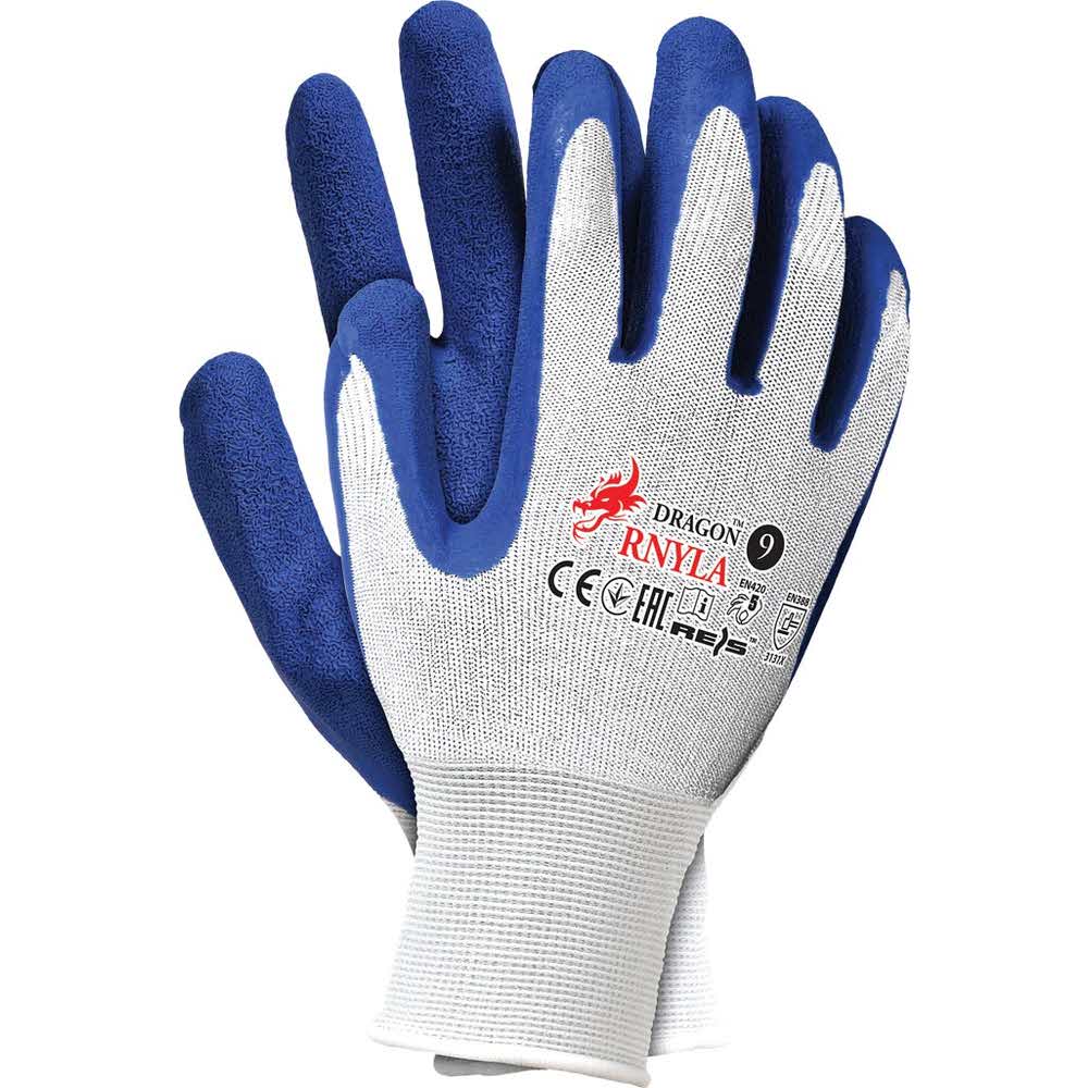 Rękawice ochronne wykonane z nylonu z dodatkowym powleczeniem z latexu. – wykonane z nylonu, ścieg 13 – powlekane latexem o chropowatej strukturze zapewniającej doskonałą chwytność, nie powodując usztywnienia rękawicy – latex wykazuje odporność na detergenty oraz kwasy – zarówno tkanina jak i oblanie odporne na rozdarcie, rozciągliwe i wytrzymałe, mimo iż są cienkie – elastyczne, dzięki czemu świetnie dopasowują się do dłoni – zapewniają doskonałą manualność przy ograniczeniu ślizgania się trzymanego przedmiotu – niepylące – potocznie zwane blue-bird – zgodne z normami EN388 (poziomy odporności: 3 1 3 1 X) i EN420