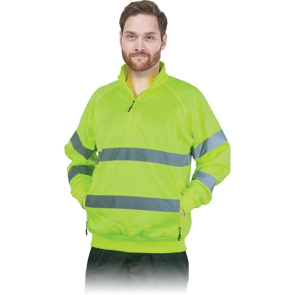 Bluza ochronna. – 65% poliester, 35% bawełna – gramatura 300 g/m2 – zapinana na suwak w górnej części bluzy – kołnierz w formie stójki – dwie zasuwane kieszenie po zewnętrznej stronie – pasy odblaskowe zapewniają lepszą widoczność – dół bluzy oraz rękawy zakończone ściągaczem – spełnia wymagania norm EN20471 oraz EN13688