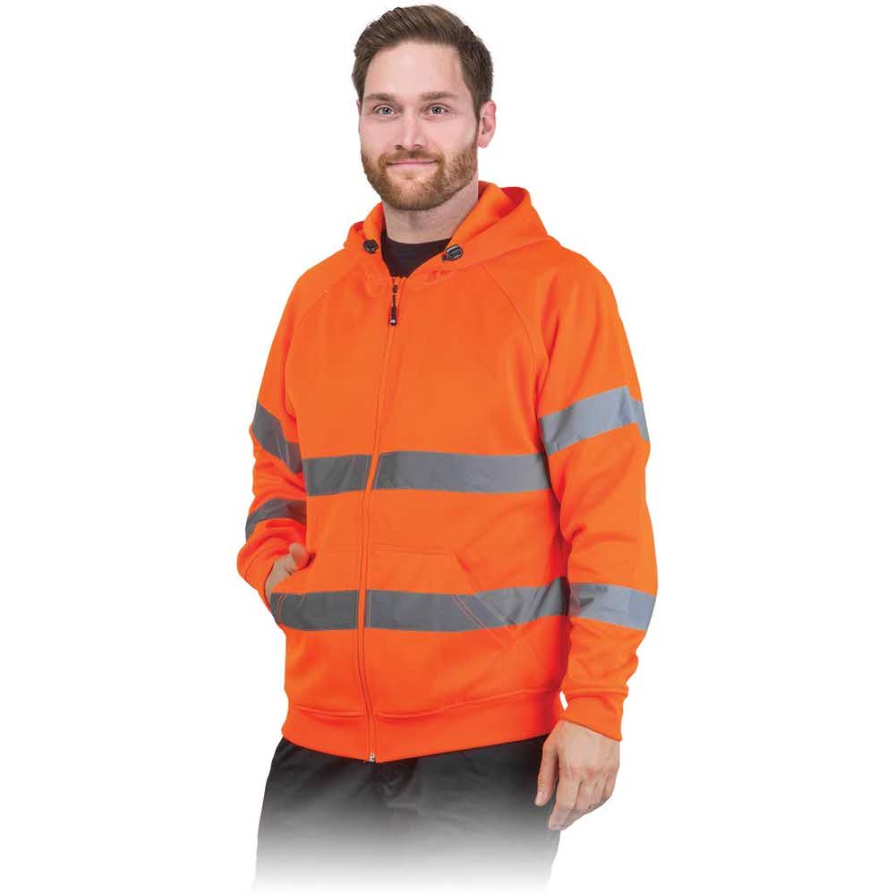 Bluza ochronna. – 65% poliester, 35% bawełna – gramatura 300 g/m2 – zapinana na suwak – kaptur ściągany na troczki – dwie kieszenie w dolnej części bluzy – pasy odblaskowe zapewniają lepszą widoczność – dół bluzy oraz rękawy zakończone ściągaczem – spełnia wymagania norm EN20471 oraz EN13688