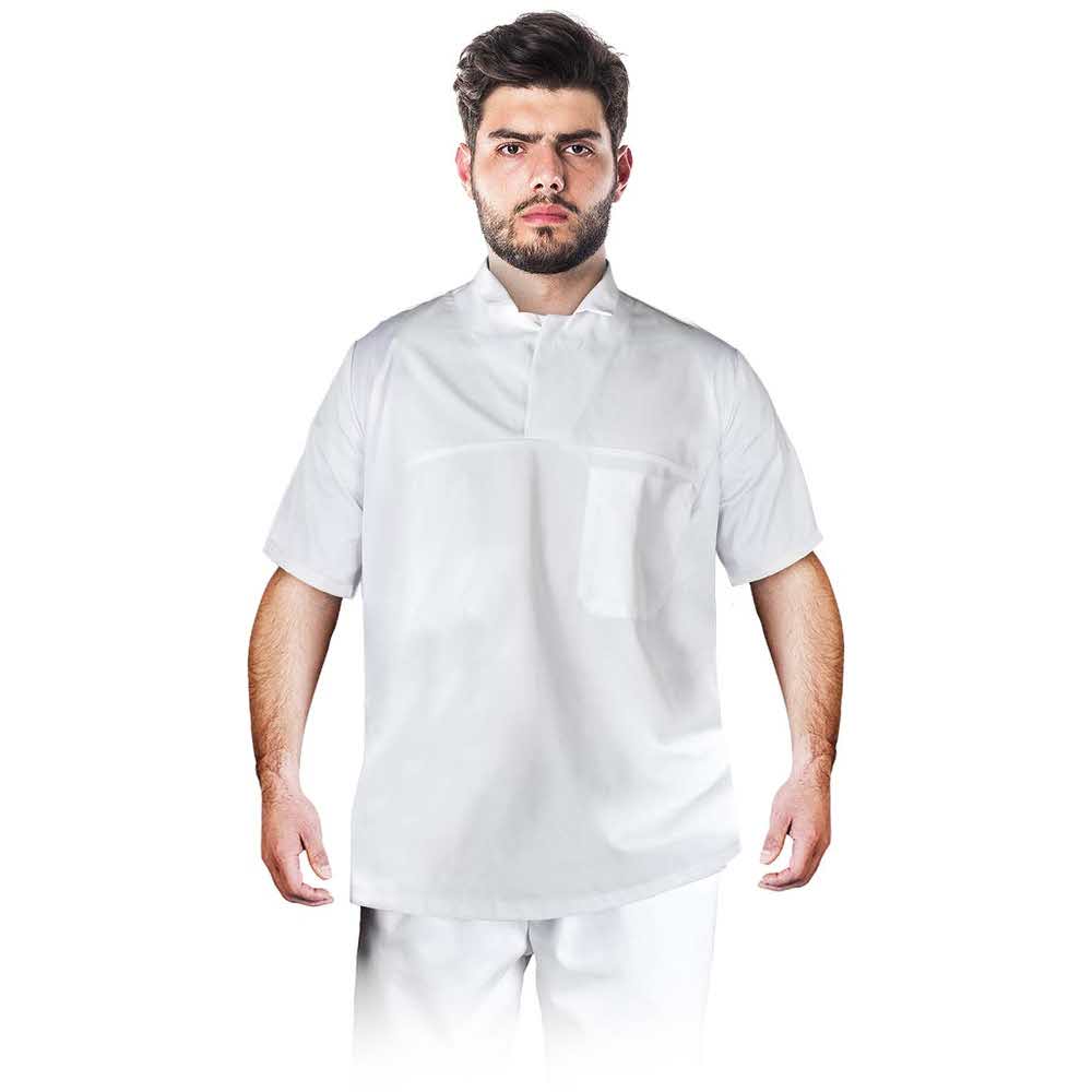 Bluza ochronna z krótkim rękawem. – 65% poliester, 35% bawełna – gramatura 210 g/m2 – przystosowana do pracy w systemie HACCP (przemysł spożywczy) – bez guzików – zakładana przez głowę – kieszeń od wewnątrz bluzy z lewej strony – przy karku wykończona kołnierzykiem – po bokach niewielkie rozporki – odpowiednia do prania przemysłowego (maksymalna temperatura 95oC)