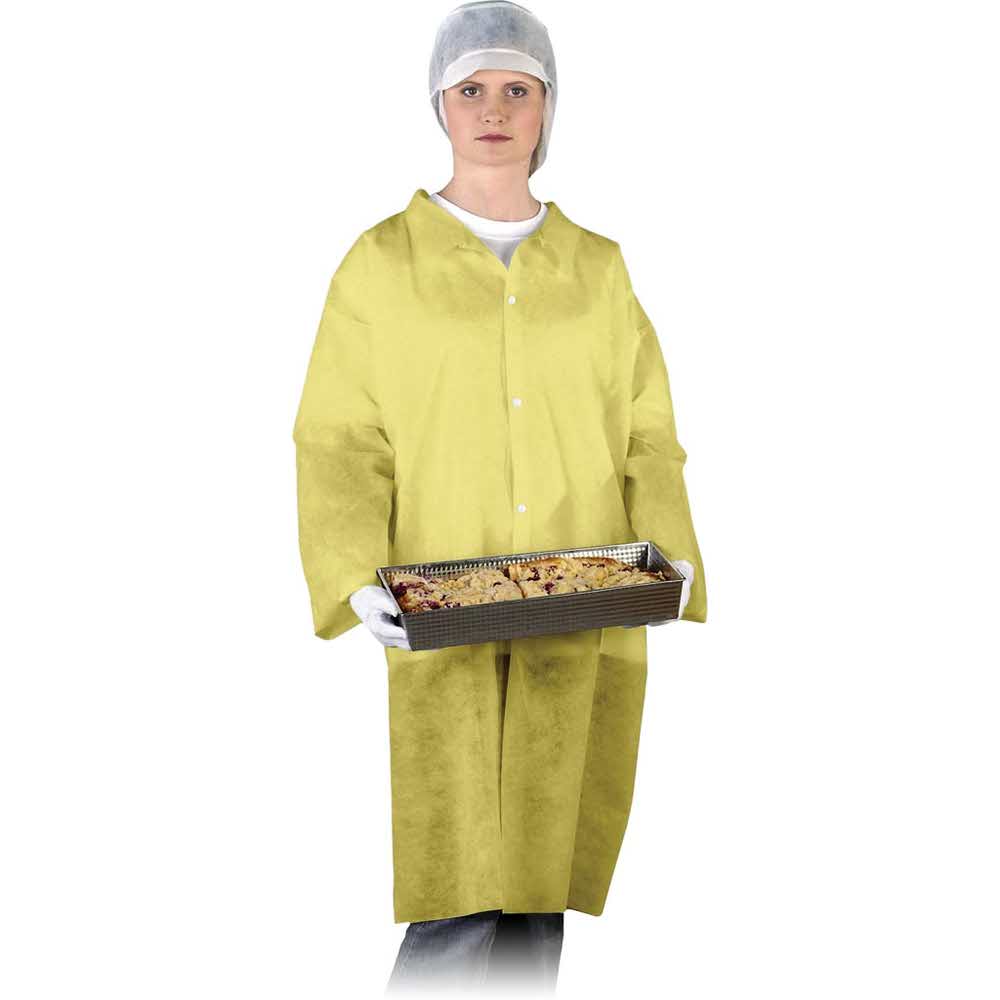 Fartuch laboratoryjny. – 100% polipropylen – zapinany na napy – pod szyją wykończony kołnierzykiem – długi rękaw