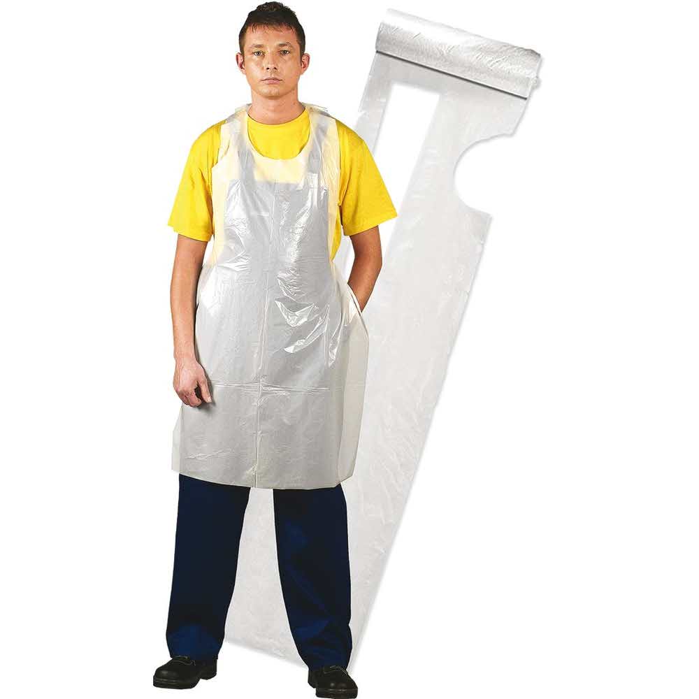 Fartuch przedni foliowy zakładany na szyję z wiązaniem z tyłu pleców. – 100% polietylen – wymiary: dł. 117 cm, szer. 70 cm – wymiary jednej rolki: dł. 38 cm, średnica 9 cm – pakowany po 100 szt. w rolce w formie zrywki