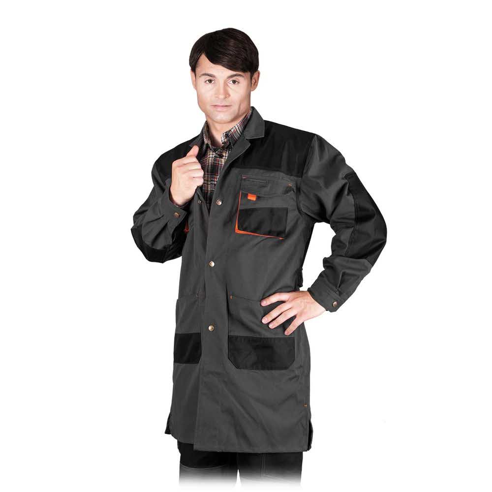 Fartuch ochronny FORMEN. – 65% poliester, 35% bawełna – gramatura 270 g/m2 – zapinany na napy – w partii pasa z tyłu fartucha pasek z tego samego materiału – dwie kieszenie na klatce piersiowej na rzepy, w tym jedna na telefon oraz dwie wąskie kieszonki na przybory np. długopis – rękawy zapinane na napy – na ramionach, kieszeniach oraz łokciach dodatkowe wzmocnienie co zwiększa wytrzymałość fartucha na przetarcia – staranne wykonanie oraz zwiększona wytrzymałość zapewniają wysoki komfort użytkowania – certyfikat OEKO-TEX® Standard 100 (testy na zawartość szkodliwych dla zdrowia substancji)