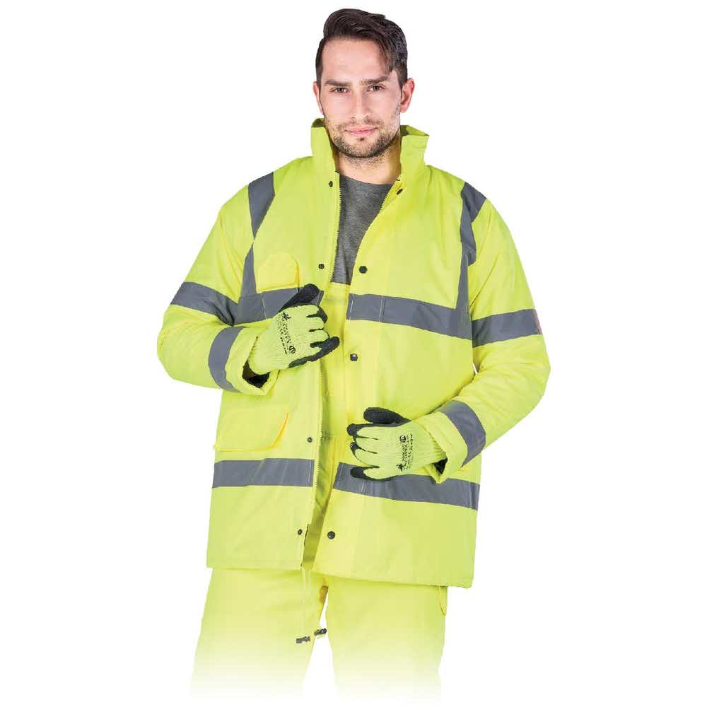 Kurtka zimowa z pasami odblaskowymi idealna dla drogowców. – powłoka 100% poliester Oxford na PCV – wyściółka 100% poliester o gramaturze 160 g/m2 – podszewka 190T poliester tafta – zapinana na suwak z dodatkowym zapięciem na napy, kaptur chowany w kołnierzu – po zewnętrznej stronie trzy kieszenie, w tym jedna na komórkę zapinana na rzep – od wewnątrz dodatkowa kieszeń zapinana na rzep – dół kurtki ściągany na gumkę – pikowana od wewnątrz, dzięki czemu zapobiega przesuwaniu się ociepliny – odblaskowe pasy na dole kurtki, na rękawach oraz w formie szelek zwiększające widoczność – zgodna z normą EN471* (*dotyczy materiału)