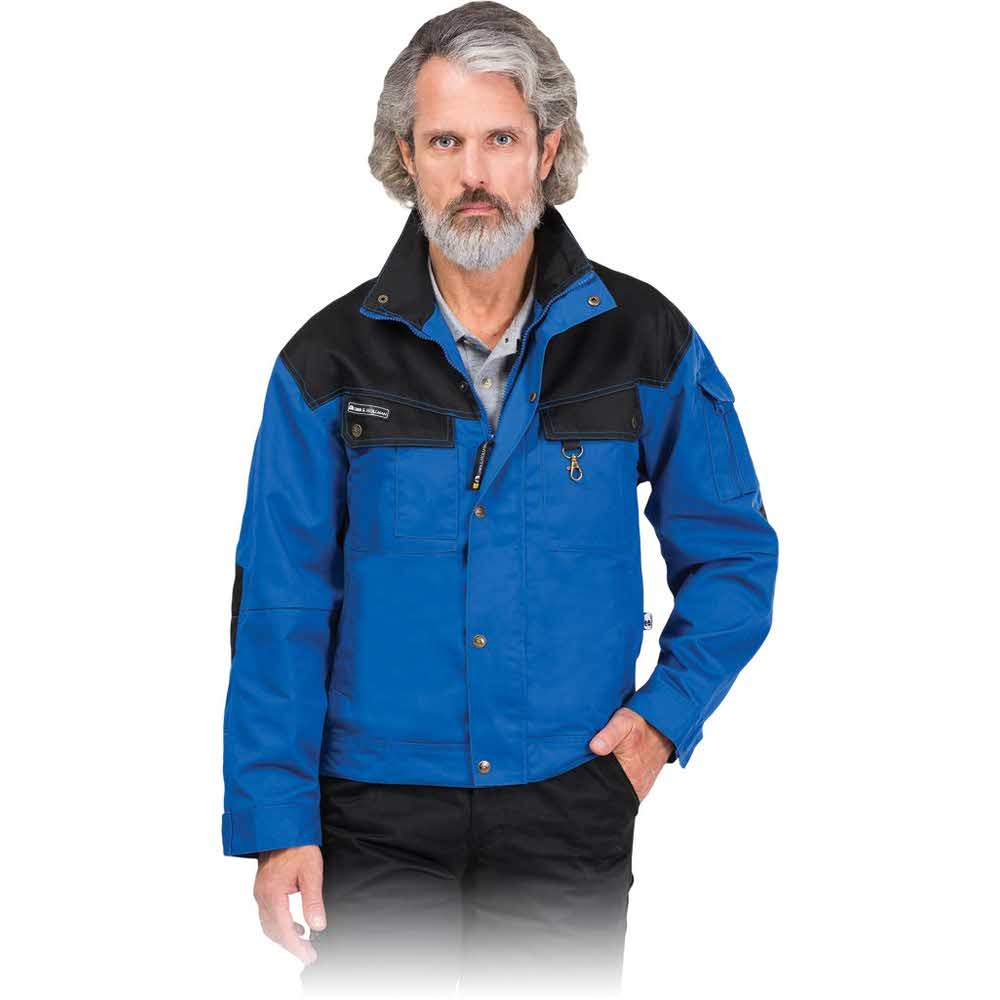 Kurtka ochronna. – powłoka 65% poliester, 35% bawełna o gramaturze 300 g/m2 – podszewka 100% poliester typu tafta 190T – zasuwana z dodatkowym zapięciem na napy – dwie kieszenie w dolnej części kurtki – w górnej części dwie kieszenie zapinane na napy z dodatkową kieszonką na telefon komórkowy i zawieszką na klucze – na rękawie kieszonka zapinana na rzep oraz druga na suwak – wzmocnienia na łokciach z czarnego materiału zabezpieczają przed zabrudzeniem – rękawy z dodatkowymi zapięciem na napy