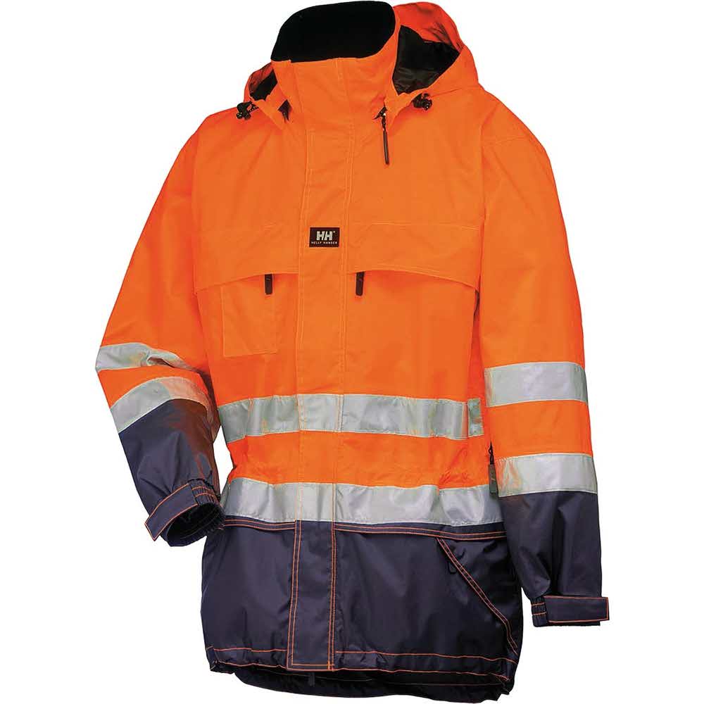 Kurtka LUDVIKA PARKA. – kolor fluorescencyjny 100% poliester o gramaturze 200 g/m2 powlekany PU – kolor kontrastowy 100% nylon o gramaturze 160 g/m2 powlekany PU – wyściółka 100% poliester o gramaturze 120 g/m2 – podszewka 100% nylon – odblaskowe pasy – wentylacja pod ramionami – pętelki z funkcją Click.on™ na dodatkowe akcesoria – sześć kieszeni – dwie na klatce piersiowej zapinane na suwak, w tym jedna z dodatkową kieszonką na telefon, dwie przednie na suwak pod klapką oraz jedna boczna – odsuwany kaptur z regulacją na rzep, dostosowany do noszenia na hełmie ochronnym – przedłużany tył – spełnia wymagania norm EN471 (3 2), EN343 (3 3), EN342 (0,326(B)(2,10clo) 2 2)