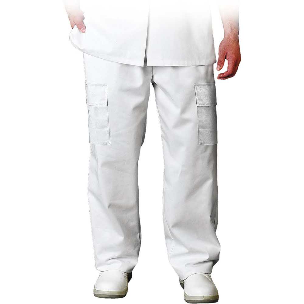 Spodnie ochronne do pasa. – 65% poliester, 35% bawełna – gramatura 230 g/m2 – zapinane na guziki – trzy zewnętrzne kieszenie: dwie na nogawkach zapinane na rzepy i jedna z tyłu – rozciągliwa gumka w pasie pozwala lepiej dopasować rozmiar – idealne dla branży kosmetycznej, medycznej, jak i chemicznej – stosowane do pracy w laboratoriach – odpowiednie do prania przemysłowego (maksymalna temperatura 95°C)