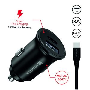 Ładowarka samochodowa SWISSTEN 35W 2 portowy USB C USB A kabel USB C Samsung Super fast charging