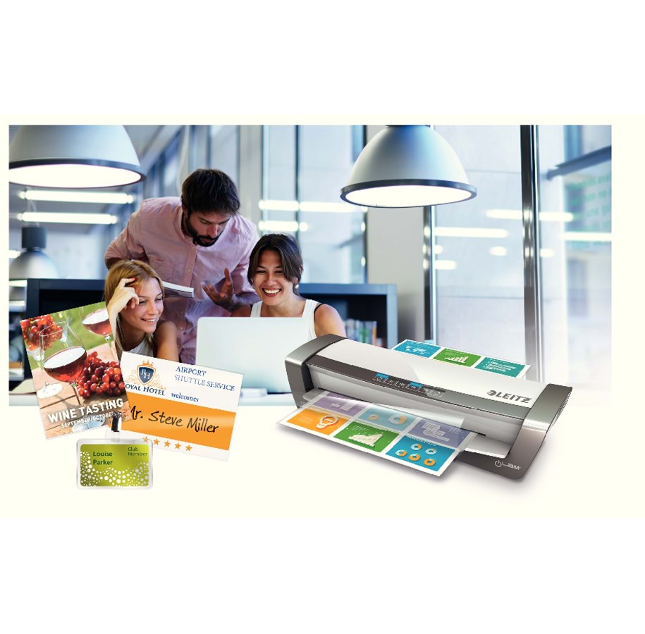 Jeśli szukasz urządzenia do większego biura, koniecznie sprawdź laminator iLam Office A4 lub A3, nagrzewający się w 60 sekund. Jego smukły i stylowy wygląd to nie jedyna zaleta. Laminator zużywa wyjątkowo mało energii. Jeśli postanowisz go kupić, w prezencie otrzymasz mini głośnik konferencyjny Leitz WOW z Bluetoothem.