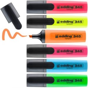 Zakreślacze Edding 345, 6 Kolorów, Etui Uniwersalne zakreślacze ze ściętą końcówką umożliwiającą tworzenie linii o wymiarach od 2 do 5 mm. Przeznaczone do wszystkich rodzajów papieru. Tusz w kolorze fluorescencyjnym na bazie wody. Dostępne w etui 6 szt. w różnych kolorach.